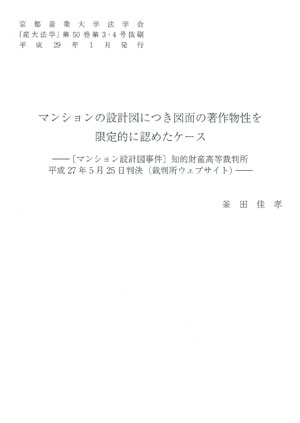 マンションの設計図につき図面の著作物性を限定的に認めたケース [マンション設計図事件] 知的財産高等裁判所 平成27年5月25日判決 発行:2017年1月 京都産業大学法学会 |